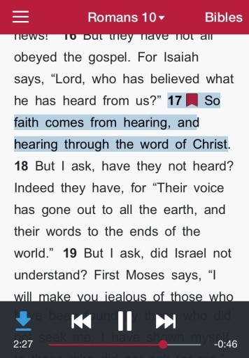 说明 ** 语言。圣经。**超过 300 个版本的圣经,以 222 种独特语言发行,这些都在一个应用程式中。信奉圣言和全球*的有声圣经事工组织! ? 阅读。聆听。分享。? 立即开始阅读与聆听。不需要额外下载 (音讯需要互联网连线)。? 具有众多语言的剧情片和非剧情片音讯。? 185 种独特的语言,例如,阿拉伯文、中文、法文、西班牙文、菲律宾文、泰文...? 轻松分享。透过 Facebook、Twitter、SMS、电子邮件或轻触复制分享所有圣经诗句。 ? 注释。同步。完成。? 书签、醒目提示和新增注释。只需轻触即可退出简易、功能强大的个人圣经学习工具。? 保持同步。使用免费的 Bible.is 帐号,在 Bible.is Online (www.bible.is) 和 Android 与 iOS 装置之间同步书签、醒目提示及注释。? 完成。每日程式,例如,Bible in a Year、Proverb a Day 和 New Testament in 40 Days 帮助您实现您的圣经目标。 ? 家。教堂。行进间。? 在家。做菜、休息时聆听,或沉浸于寂静时光时聆听和阅读。? 在教堂。适合在布道或研读圣经时建立书签、标注醒目提示、注释或分享诗句。? 行进间。在公车上、汽车内、上学途中或工作时按下播放即可聆听。? 事工组织。布道时分享诗句,或与说不同语言的朋友分享诗句。 ? 事工组织? Faith Comes By Hearing (FCBH) 的事工组织 Bible.is? FCBH 是全球*的有声圣经事工组织,致力于以音讯方式将圣言 (Word of God) 传递给全球贫困者和文盲。? Bible.is 将永远免费。我们希望团结教会并培养门徒。获得祝福! ? 语言下面是 *一小部分* 可用的圣经语言 (如需完整信息,请参阅:www.bible.is/languages)阿拉伯文、Ashaninka 文、Bafut 文、保加利亚文、宿雾语、普通话中文,粤语中文、克罗地亚文、捷克文、丹麦文、荷兰文、埃维文、芬兰文、法文、德文、瓜密文、海地文、Huasteco Veracruz 文、印尼文、意大利文、日文、马达加斯加文、葡萄牙文、罗马尼亚文、俄文、索马利文、西班牙文、瑞典文、泰文、乌克兰文,越南文.. ? 完整的功能清单★ 同时聆听和阅读圣经。★ *多的圣经语言选择,185 种语言可供选择!★ 预先加载英文标准版 (ESV) 圣经。★ 快速音讯串流。当您连上互联网时,圣经音讯串流立即可以使用。★ 搜寻。搜寻圣经内容,并依篇别或清单检视结果。查询特定的篇别、章节、诗节,并直接前往该处。★ 脱机存取。将任何圣经文字下载到装置,以便从任何地方阅读 (附注:尚未提供音讯下载)。★ 每日程式。以您喜欢的方式阅读或聆听圣经。★ 注释。只需轻触,即可对圣经诗句建立书签、标注醒目提示与分享。★ 帐号同步。让您的书签、醒目提示和注释与您的 iOS、Android 和 Web 装置同步。 ? 本地化- Bible.is 圣经应用程式也已经完全本地化为下列语言:阿拉伯文 (?????? ??????)、西班牙文 (Español)、中文 (中文)、荷兰文 (Nederlands)、意大利文 (Italiano)、法文 (Française)、葡萄牙文 (Português) 和俄文 (русский язык)。 - Bible.is:阅读。聆听。分享。Faith Comes By Hearing 的事工组织。