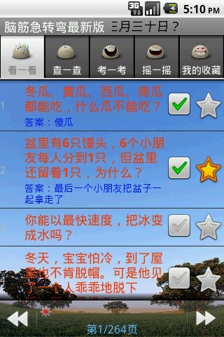 本“脑筋急转弯*版”收集了网络上流行的脑筋急转弯题目,要想提高智商、培养幽默感、拥有创新能力的话,快来下载“脑筋急转弯*版”吧。声明:本软件为【工作时间无广告版本】,*免费使用,内嵌广告,敬请谅解!资料来源于网络,如有侵犯您的权益,请及时告知!功能列表:-----------------精选出近4000多条趣味盎然的脑筋急转弯题目--"摇一摇"功能,支持摇动手机找题目,增加游戏趣味性--趣味测试,在设定的时间内完成小测试--隐藏答案,让您领会和猜想,增加游戏的乐趣;--快捷搜索,查询脑筋急转弯的答案--一键收藏,支持设置喜爱脑筋急转弯的功能--重启续看,再次启动时接着上次看到的地方看--好友分享,支持发送好玩的脑筋急转弯或者推荐此软件给好友等功能--版本升级,支持检查版本是否*的功能使用中遇到的任何问题,欢迎反馈!