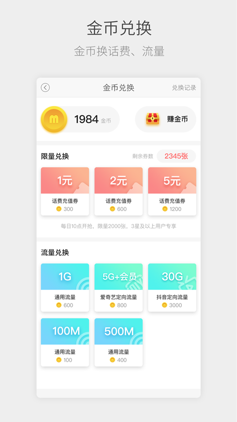 2.「签到送金币」:每日签到送金币送流量,每月首签送500M哦;