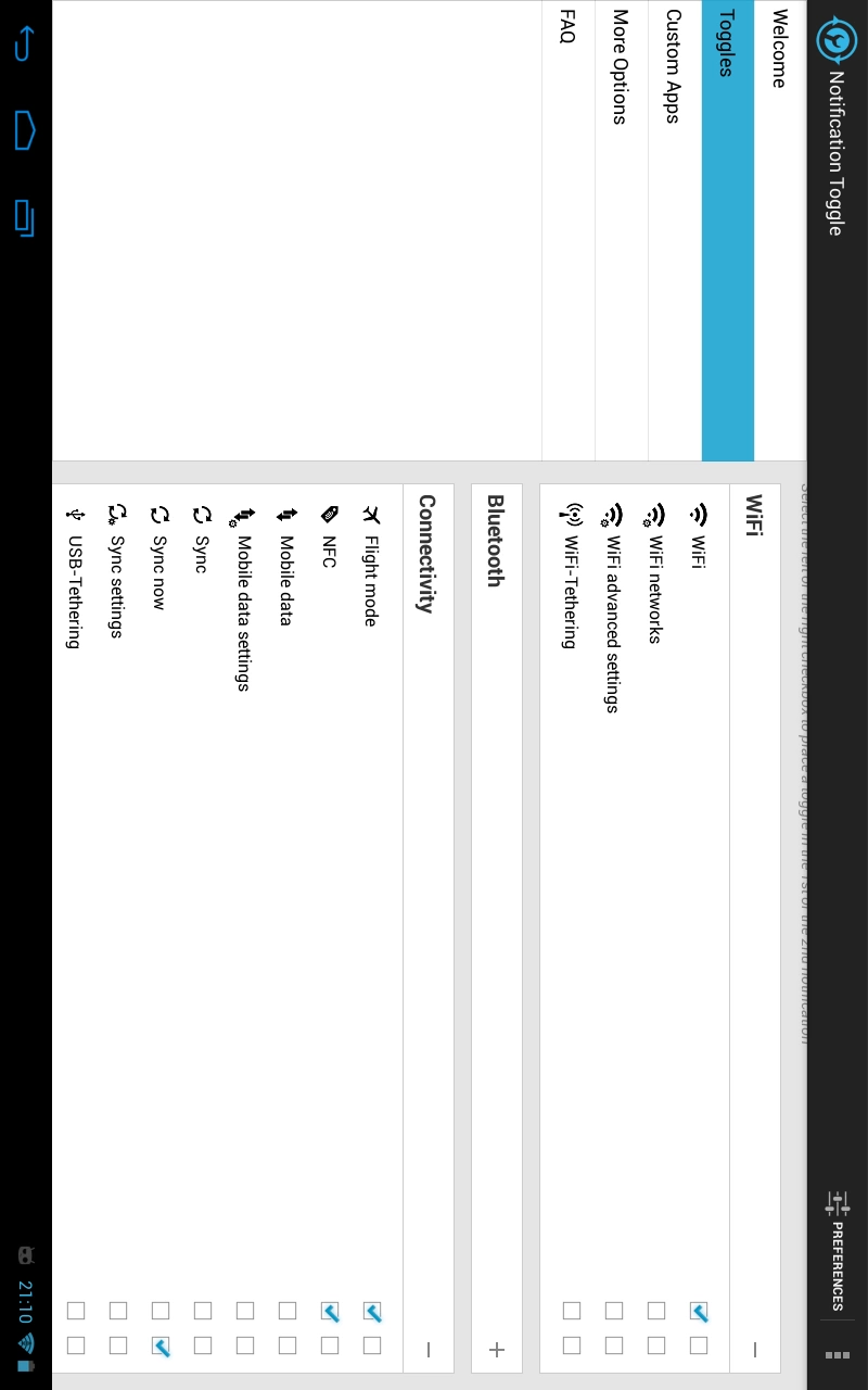 Notification Toggle creates notifications in the Android status bar to let you quickly switch WiFi, Bluetooth, Silent mode, Screen rotation and Flight mode on and off or to adjust the screen brigthness (and many more...)You can also add shortcut to your own apps into the notification bar!In the settings, you can choose which notifications should be active. All icons & colors can easily be changed through the app for full customization!Some notes:? Not every toggle will work on every device? Some settings aren't changeable by user apps, so it will bring you directly to the Android settings? Exclude from task-killers!? Some toggles require root access? The app can not remove the build-in toggle notification on Samsung phones? Please read the FAQ in the app before posting a review--------------------Available toggles & shortcuts:? WiFi? Bluetooth? Sound / Vibration, Sound / Silent, Sound menu? Brightness mode / menu / 5 predefined stages? Screen timeout dialog? Wake lock? Rotation? Flight mode? Mobile data? NFC? Flashlight (might require "TeslaLED" app)? Sync & Sync now? WiFi- & USB-Tethering? Music: previous / next / pause? WiFi settings / advanced settings? Bluetooth settings, Bluetooth visbility? GPS? Mobile data settings? Data usage? Battery? Camera? next Wallpaper (requires "Wallpaper Changer" app)? Lockscreen (requires "Delayed Lock" app)? Shutdown & Reboot (requires root)? own apps & shortcuts (shortcuts feature requires an in-app purchase)------------------This awesome app icon is made by http://www.graphical360.com :)If you don't like the default icons, click on 'Icons & Colors' and use your own icons or use the 'Icon Downloader for NT' app do download alternative icons made by xda users.--------------------Permissions:ACCESS_FINE_LOCATION - toggle GPS on Android 2.2 devicesACCESS_NETWORK_STATE - toggle wifi tetheringBILLING - for in-app billingBLUETOOTH_ADMIN & BLUETOOTH - toggle BluetoothCALL_PHONE - direct call contacts from notificationCAMERA & FLASHLIGHT - turn on camera flashlightCHANGE_NETWORK_STATE - toggle mobile data on 2.3+CHANGE_WIFI_STATE & ACCESS_WIFI_STATE - toggle WiFiEXPAND_STATUS_BAR - to close the status bar on ICS devicesMANAGE_USB - toggle usb tetheringMODIFY_PHONE_STATE - mobile data toggling on Android 2.2READ_EXTERNAL_STORAGE - to load custom iconsRECEIVE_BOOT_COMPLETED - place the notifications after bootSYSTEM_ALERT_WINDOW - necessary on Android 2.x for detecting which toggle was clickedVIBRATE - for haptic feedback optionWAKE_LOCK - for the wake lock toggleWRITE_APN_SETTINGS - fallback method to toggle mobile data on Android 2.xWRITE_EXTERNAL_STORAGE - to save shortcut icons like contact picturesWRITE_SECURE_SETTINGS - GPS toggling on rooted pre-4.3 devicesWRITE_SETTINGS - to toggle various stuff like rotation & screen brigthnessWRITE_SYNC_SETTINGS - toggle sync
