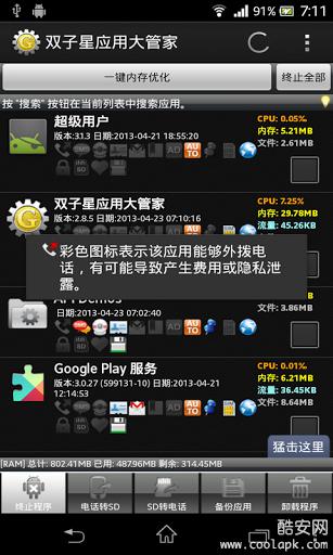 双子星应用大管家(英文名称 Gemini App Manager),应用程序风险判断(吸费、隐私、恶意等),自动启动管理(ROOT),内存优化,移动应用到SD卡(Android2.2以上),卸载应用,备份到SD卡等等。