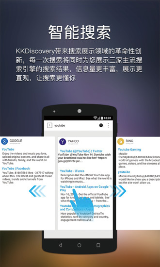 KK浏览器discover版本拥有简洁的UI和快如闪电般地网页浏览速度,给您提供最好的移动浏览和搜索体验。KK浏览器discover版本更是在搜索展示领域带来了一次革命性的创新,您的每一次搜索,KK浏览器都将同时为您展示来自三家主流搜索引擎的搜索结果,信息量更丰富,展示更直观,让搜索更懂你。KK Browser 使用智能,个性化的首页,实时为您推送当地的天气预报以及热闻趣事,您更是可以从历史记录和书签中将任意网站直接添加至您的首页导航,方便您更加快速的访问网站。现在就立即下载和安装KK Browser,感受为您量身定制的智能和个性化的浏览体验。