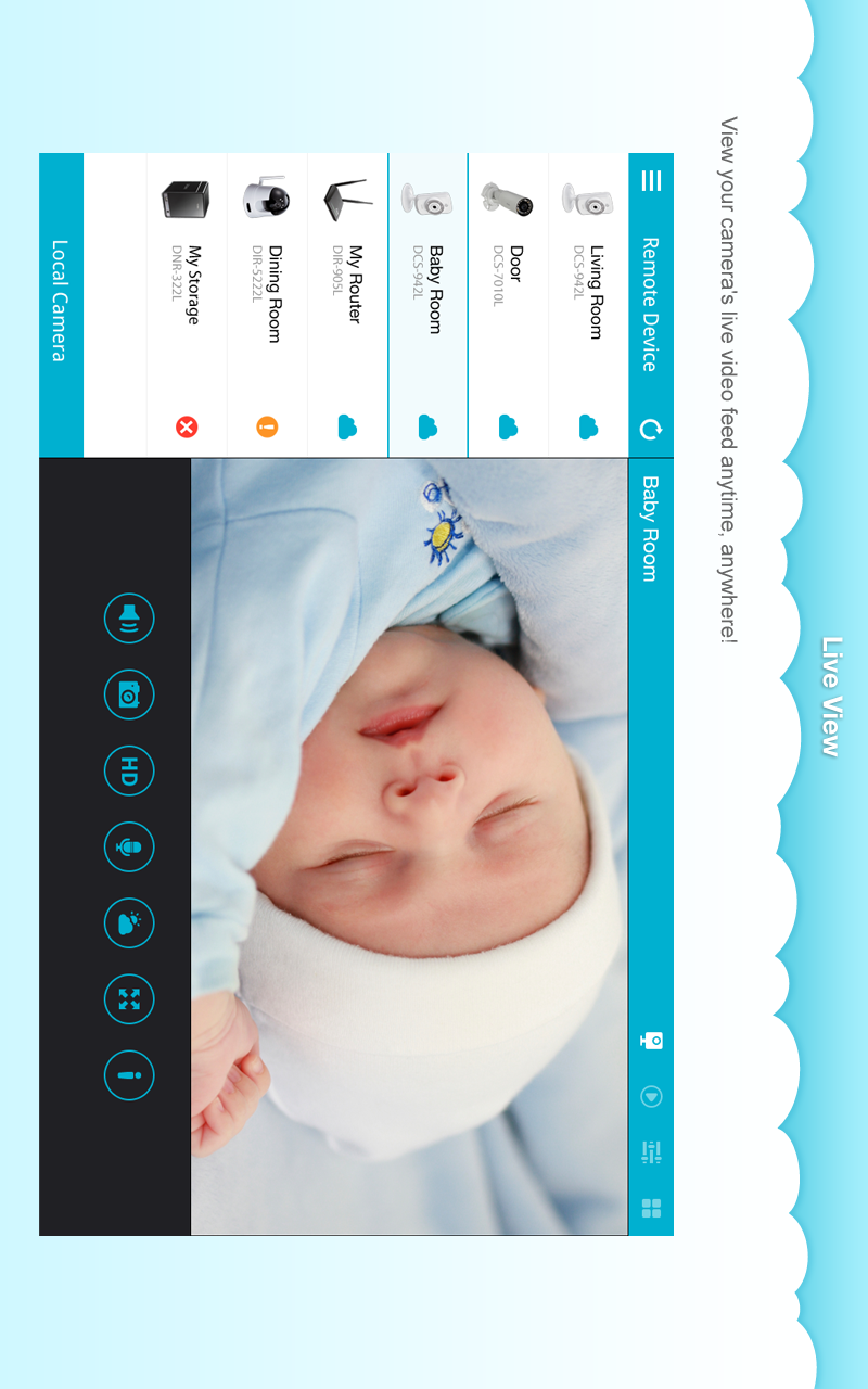 随时随地均可利用 Wi-Fi 或 3G/4G 联机快速轻松地观看云端摄影机实时内容与管理云端路由器。无论您在办公室里、外出活动,或是在渡假,都可以利用 mydlink Lite 应用程序存取云端摄影机、云端路由器和 NVR,即使身在途中也可以办到。