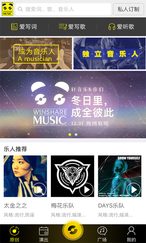 在音乐人的基础上,轩音乐还拥有一套完善的排练、录音制作、经纪管理、版权运营等后端体系,帮助音乐人实现自己的音乐梦想!同时也为校园带去真正的音乐。而在线下,轩音乐也会定期在校园内组织各类演出、活动等。所以,不管你是一个音乐人或者是听众,轩音乐都有广阔的平台让大家拥有最充实的校园音乐生活!