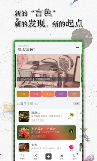 我们想让每一颗怀才的心有倾吐和施展的舞台。当文字、音乐、美图在言色相遇的时候,每个人都可以在这里进行属于自己的创作,每个人都是艺术家。