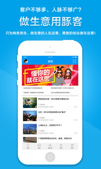做生意用豚客,抱团合力用豚客,豚客只为商务而生,做生意的人在这里!豚客商业组织通路系统-打造高效率的异地同乡商会+行业协会+企业+同姓宗亲+兴趣圈子五大关系组织商业通路,帮助创业者、商务人士建立高效生意人脉社交圈。